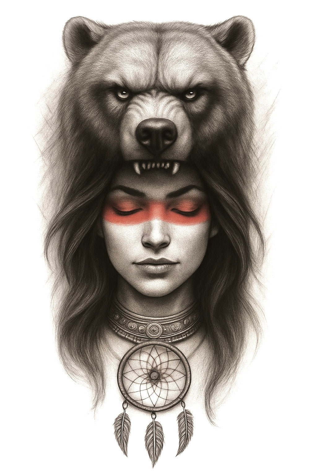 Mit geschlossenen Augen trägt sie die Kraft des Bären auf ihrem Haupt – wild, furchtlos, unbezähmbar. Der Bär gilt in vielen Native-Traditionen als Beschützer und Heiler, als Geist der Stärke und der inneren Einkehr. Er verleiht Mut in Zeiten der Dunkelheit und erinnert daran, dass wahre Kraft nicht im Angriff liegt, sondern im Wissen, wann man kämpft und wann man still in sich ruht.