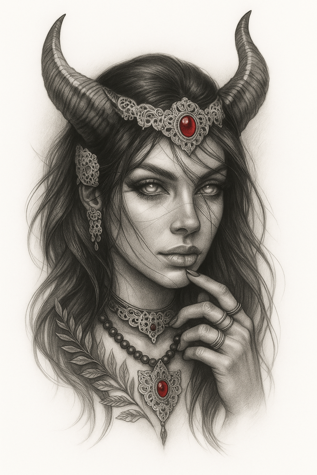 Mit Hörnern als Krone und roten Steinen als Zeichen der Macht trägt sie die Symbole der Anderswelt. Ihr Blick ist ruhig, wissend und geheimnisvoll – nicht glühend, sondern tief, wie jemand, der den Schatten nicht fürchtet, sondern ihn versteht.