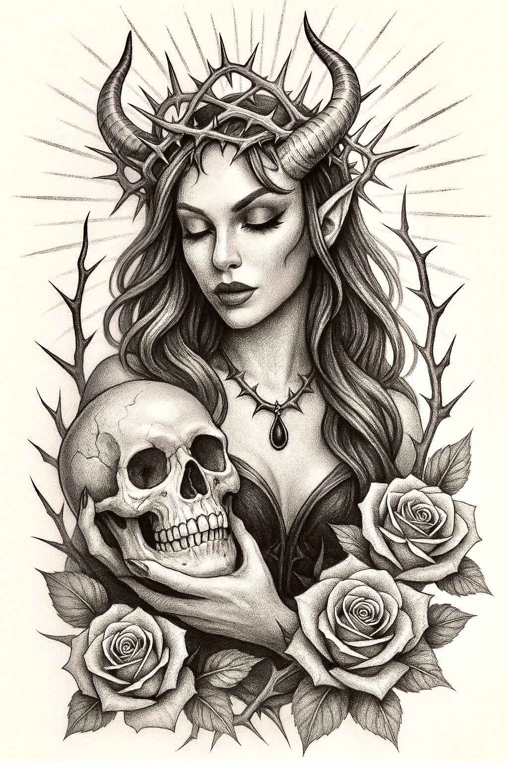 Die Frau mit Hörnern und Dornenkrone steht fĂŒr die Königin der Dunkelheit â eine Gestalt, die nicht gefĂŒrchtet, sondern verstanden werden will. Sie ist Sinnbild fĂŒr jene Kraft, die entsteht, wenn man seine Schattenseiten annimmt.