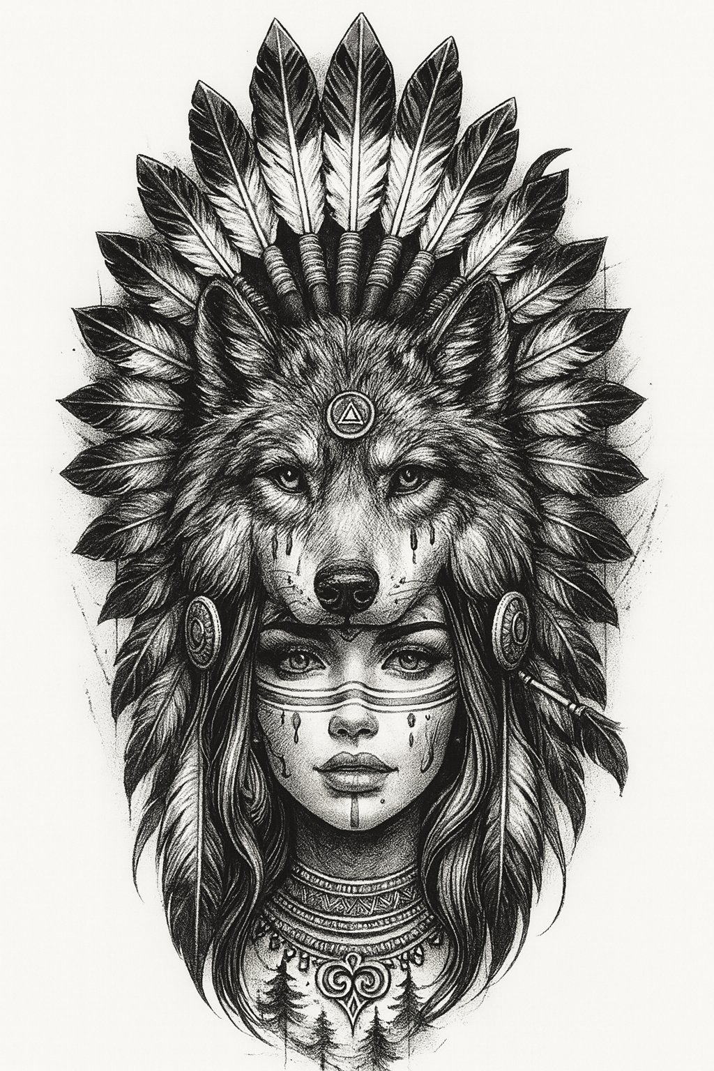 In den Kulturen der Native Americans galt der Wolf als Lehrer, Gefährte und Spiegel der Seele. Er verkörpert Instinkt, Zusammenhalt und die Fähigkeit, mit den Kräften der Natur im Einklang zu leben. Die Frau unter seinem Geist trägt die Weisheit der Ahnen: Sie lebt nicht gegen die Natur, sondern mit ihr – jedes Tier, jeder Baum, jeder Fluss ist Teil derselben großen Familie.