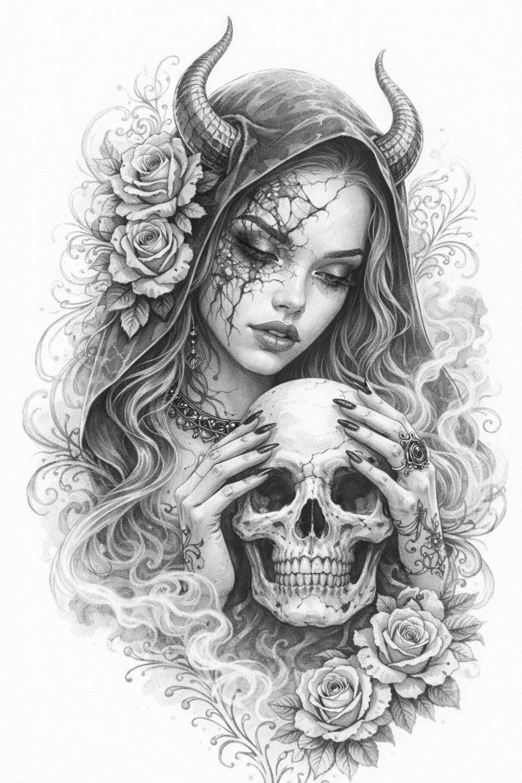 Die gesenkte Haltung macht das Motiv intimer: nicht „Show“, sondern innere Arbeit. Der Skull wird hier wie ein Anker gehalten – als Symbol für das, was war, und für das, was man endgültig beendet hat. Dornen/Smoke wirken wie ein energetischer Schutzraum: „Bis hierhin – und nicht weiter.“ Ein Motiv für Menschen, die nicht laut heilen – aber konsequent.