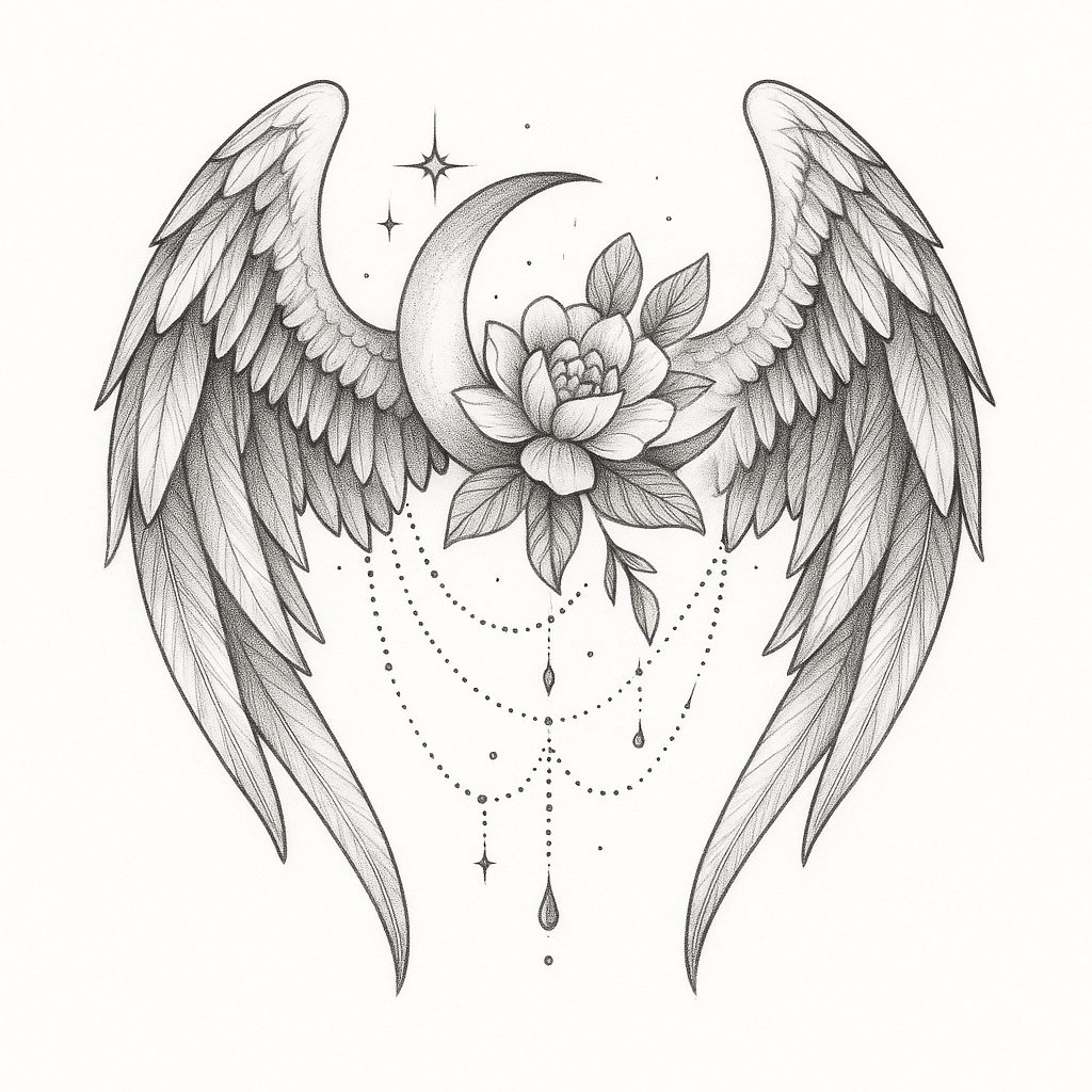 Engelsflügel, Mondsichel und Blüte vereinen sich hier zu einem Schutzsymbol.