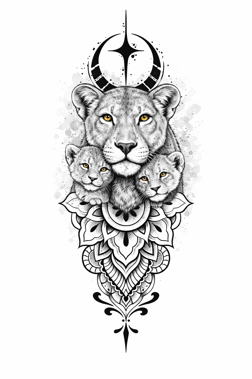 Dieses Motiv trägt eine unglaublich warme und gleichzeitig kraftvolle Energie. Die Löwin in der Mitte verkörpert Schutz, Führung und tiefe Verbundenheit, während die beiden Jungen dem Design etwas Zartes, Familiäres und Echtes geben.