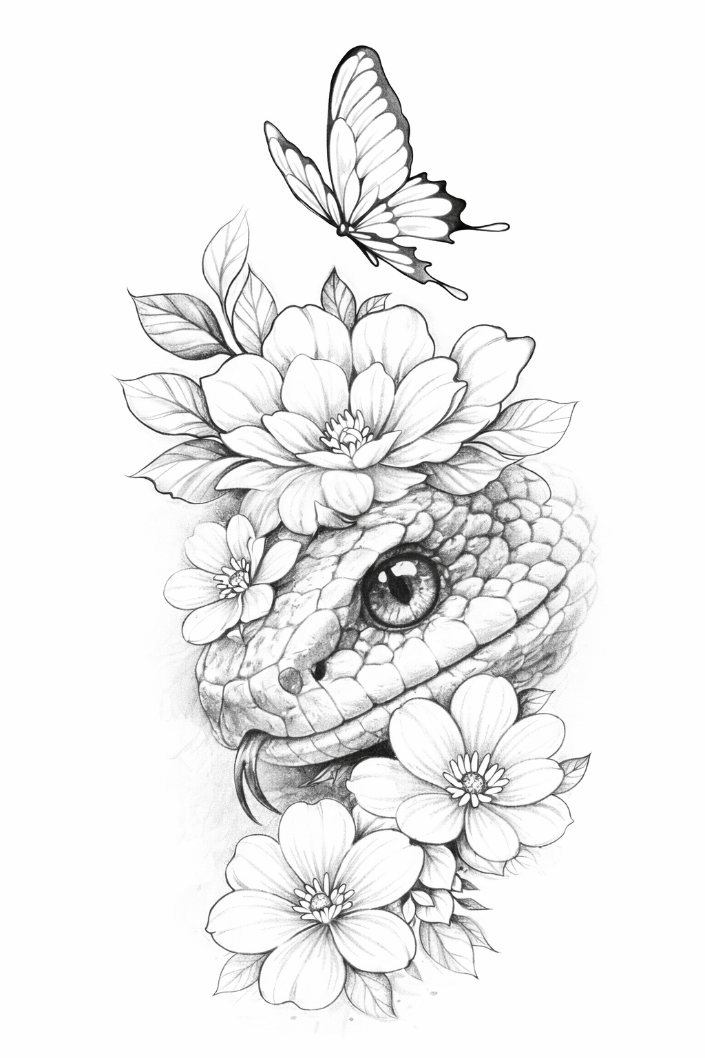 Diese Schlange trägt nicht nur eine dunkle, geheimnisvolle Energie in sich – sie zeigt vor allem Kontrolle, Wandel und magnetische Kraft. Zwischen den weichen Blüten wirkt sie nicht bedrohlich, sondern souverän. Verführerisch, klar und vollkommen bei sich. Der Schmetterling gibt dem Motiv etwas fast Poetisches: als würde hier nicht Gefahr erzählt, sondern Verwandlung.