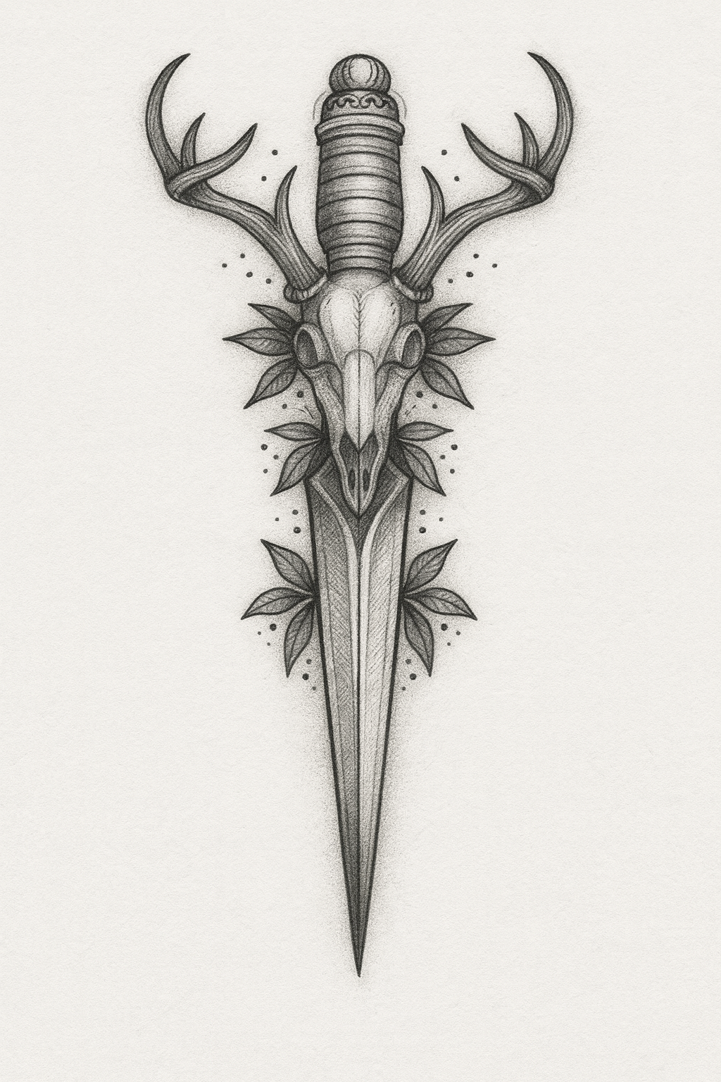 Ein Dolch, der mit einem Hirschschädel und Geweih verschmilzt – Ritual, Natur und Jägerenergie in einem Motiv.