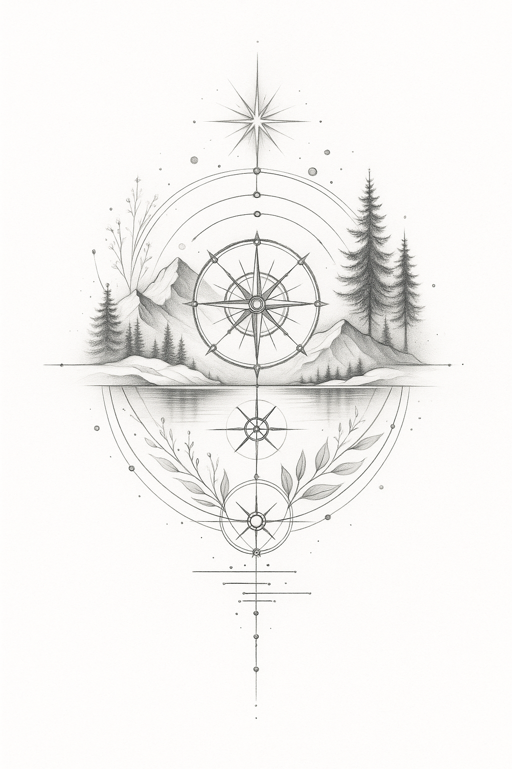 Dieses Design ist perfekt, wenn die Natur dein Rückzugsort ist und du spürst, dass dein Herz irgendwo zwischen Bergen, Wald und Sternen zuhause ist – ein Tattoo als Landkarte deiner Seele.