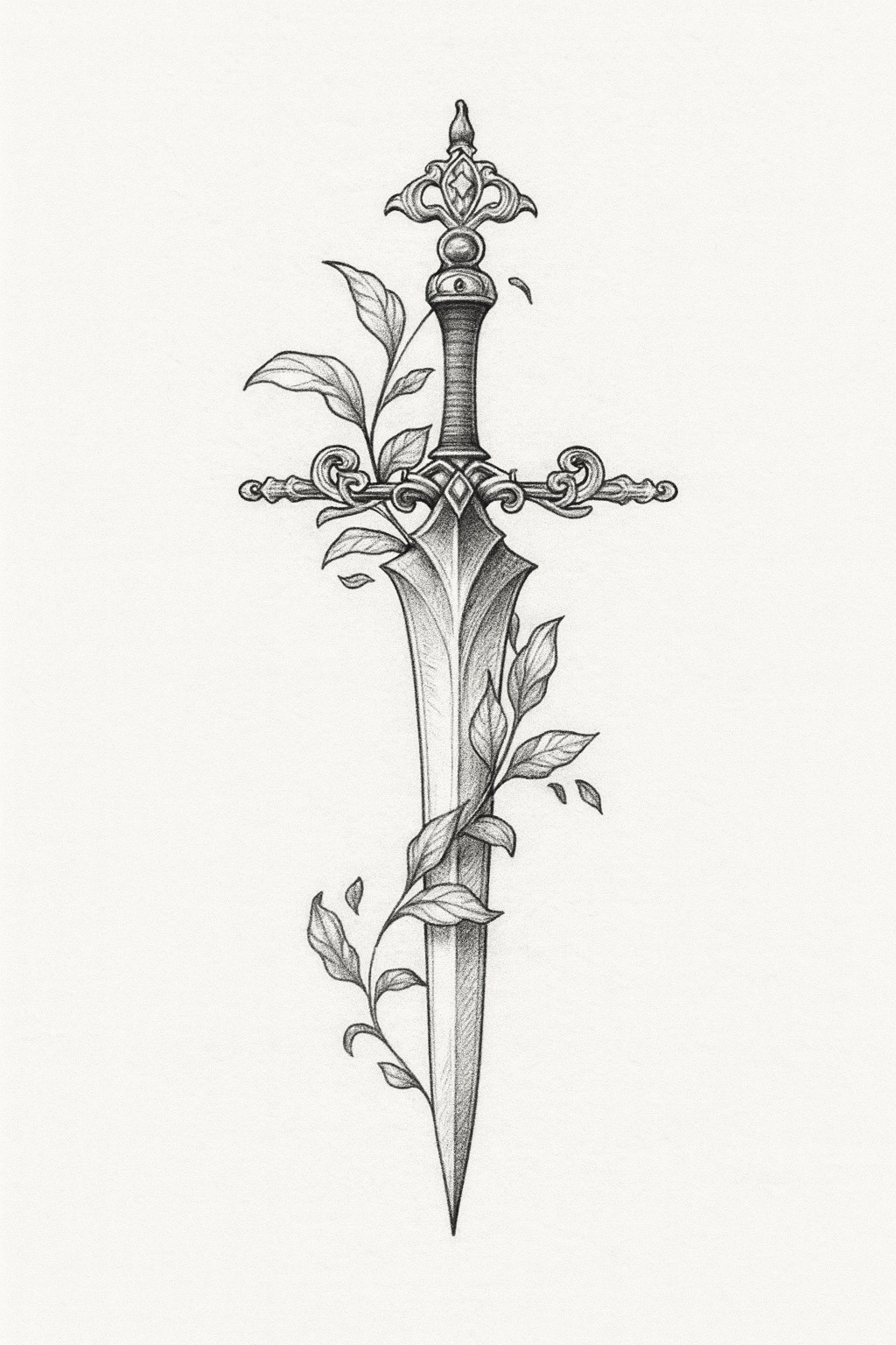 Ein verziertes Schwert, das von zarten Blättern umwachsen wird – hier treffen Klarheit und Sanftheit aufeinander.