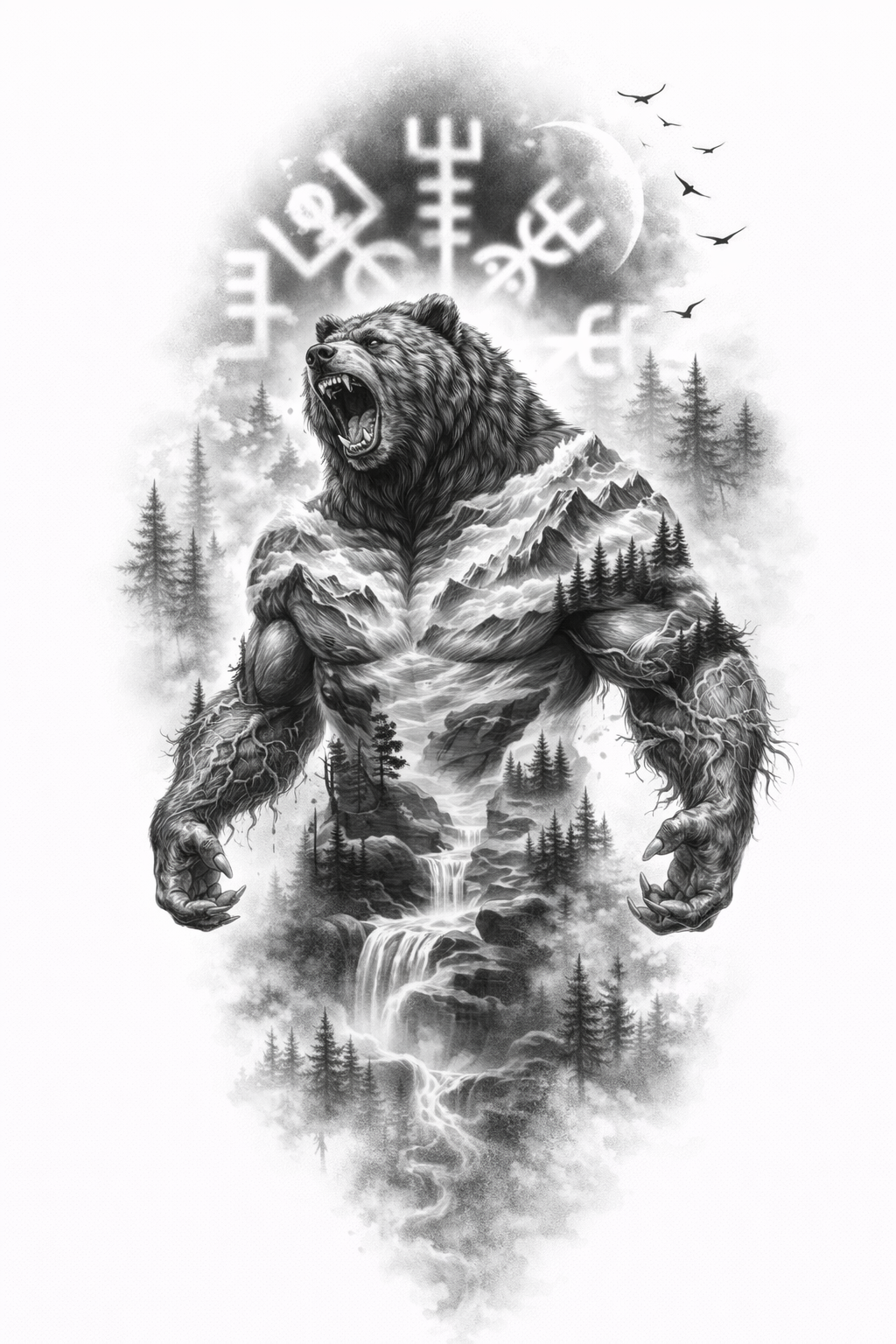 Dieses Design hat eine fast mythische Wirkung. Der Bär ist hier nicht nur Tier, sondern Naturwesen – halb Fleisch, halb Landschaft, als wäre der Berg selbst lebendig geworden. Der Wasserfall, der Wald und die nordische Symbolik im Hintergrund machen das Motiv gross, archaisch und voller spiritueller Schwere