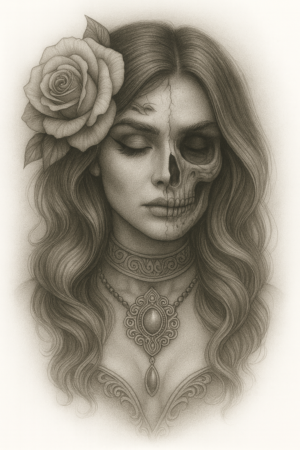 Mit geschlossenen Augen trägt sie die Ruhe einer Frau, die den Tod berührt hat und doch im Leben geblieben ist. Eine Seite ihres Gesichts ist dem Verfall geweiht, die andere zeigt Schönheit, Anmut und Stärke. Die Rose an ihrer Schläfe ist Symbol für Vergänglichkeit und Wiedergeburt, während der Schmuck an ihrem Hals ihre Würde und Macht bewahrt.