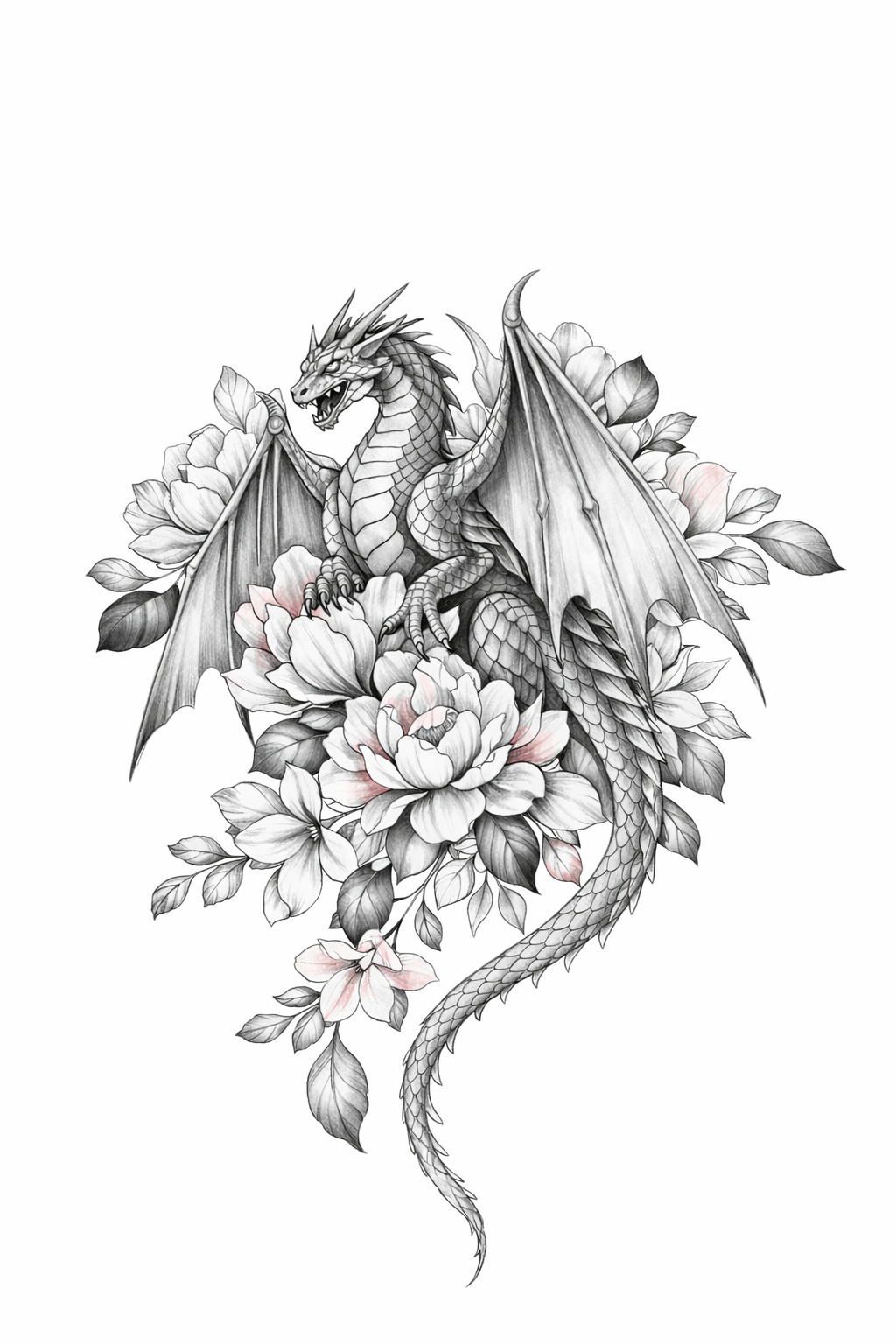 Dieses Design verbindet Kraft und Schönheit auf eine sehr elegante Weise. Der Drache wirkt stark, wachsam und majestätisch, während die floralen Elemente ihm Leichtigkeit und Tiefe geben. Genau dieser Kontrast macht das Motiv so besonders: wild und edel zugleich.