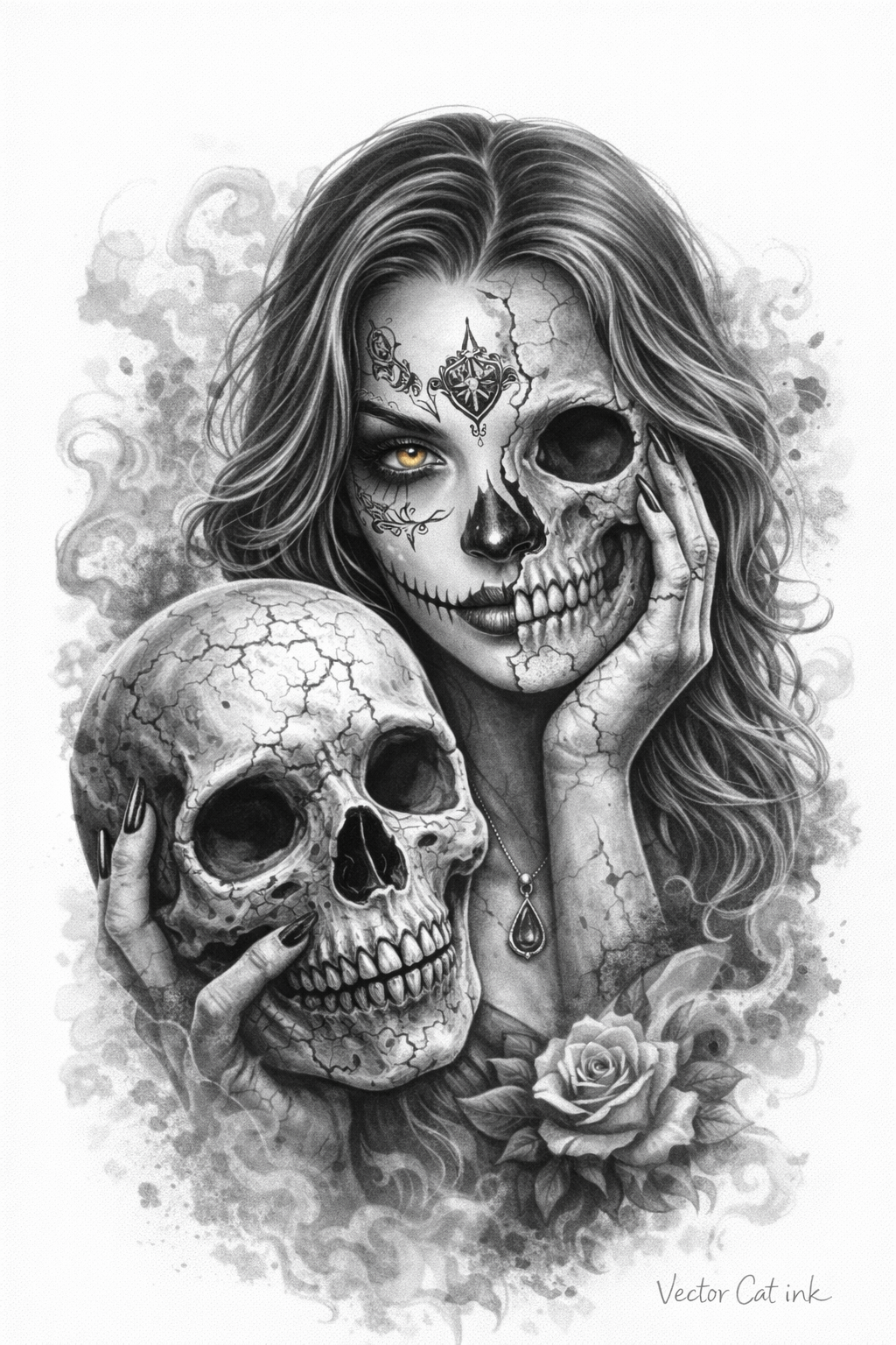 Der goldene Blick wirkt wie ein „inneres Licht“: Intuition, Würde, Klarheit. Der Schädel in der Hand macht die Message greifbar: Nicht Angst, sondern Radikal-Ehrlichkeit – „Ich verschwende mein Leben nicht. Ich wähle, was zählt.“ (klassische Memento-Mori-Ebene).