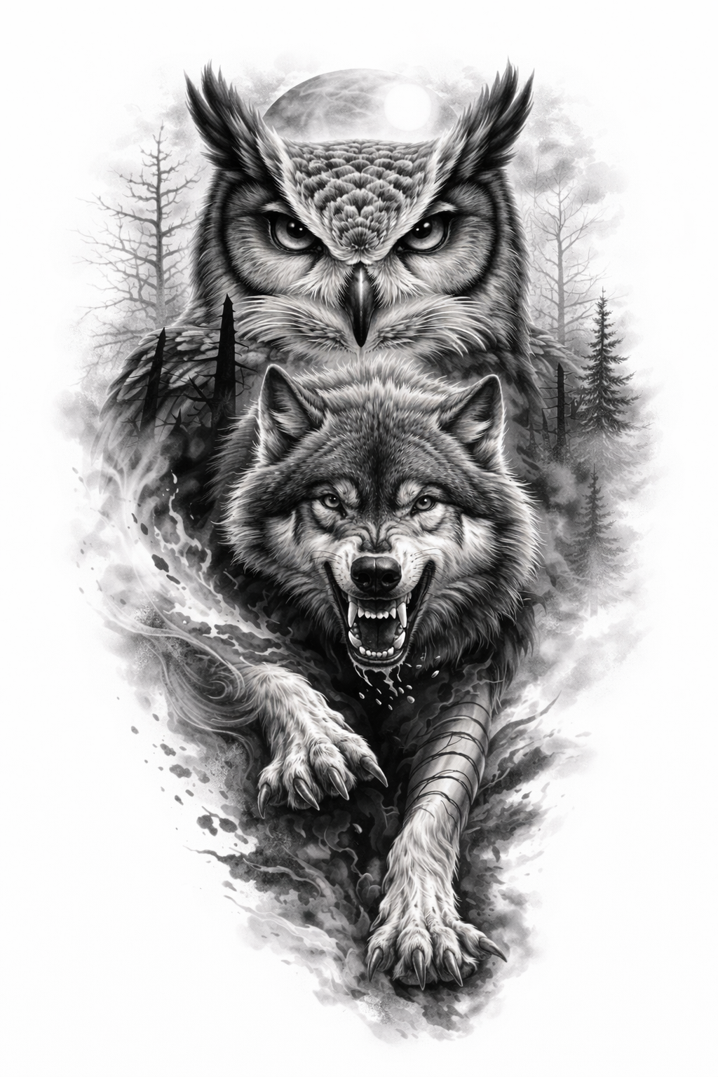 Dieses Design vereint zwei uralte Energien: Weisheit und Angriffskraft. Die Eule oben wirkt wie eine Wächterin – still, wach und allwissend. Der Wolf darunter bricht aus dem Nebel heraus, bereit zu handeln, zu schützen oder zu kämpfen. Gemeinsam entsteht ein Motiv, das Intuition und rohe Kraft in eine starke Balance bringt.
