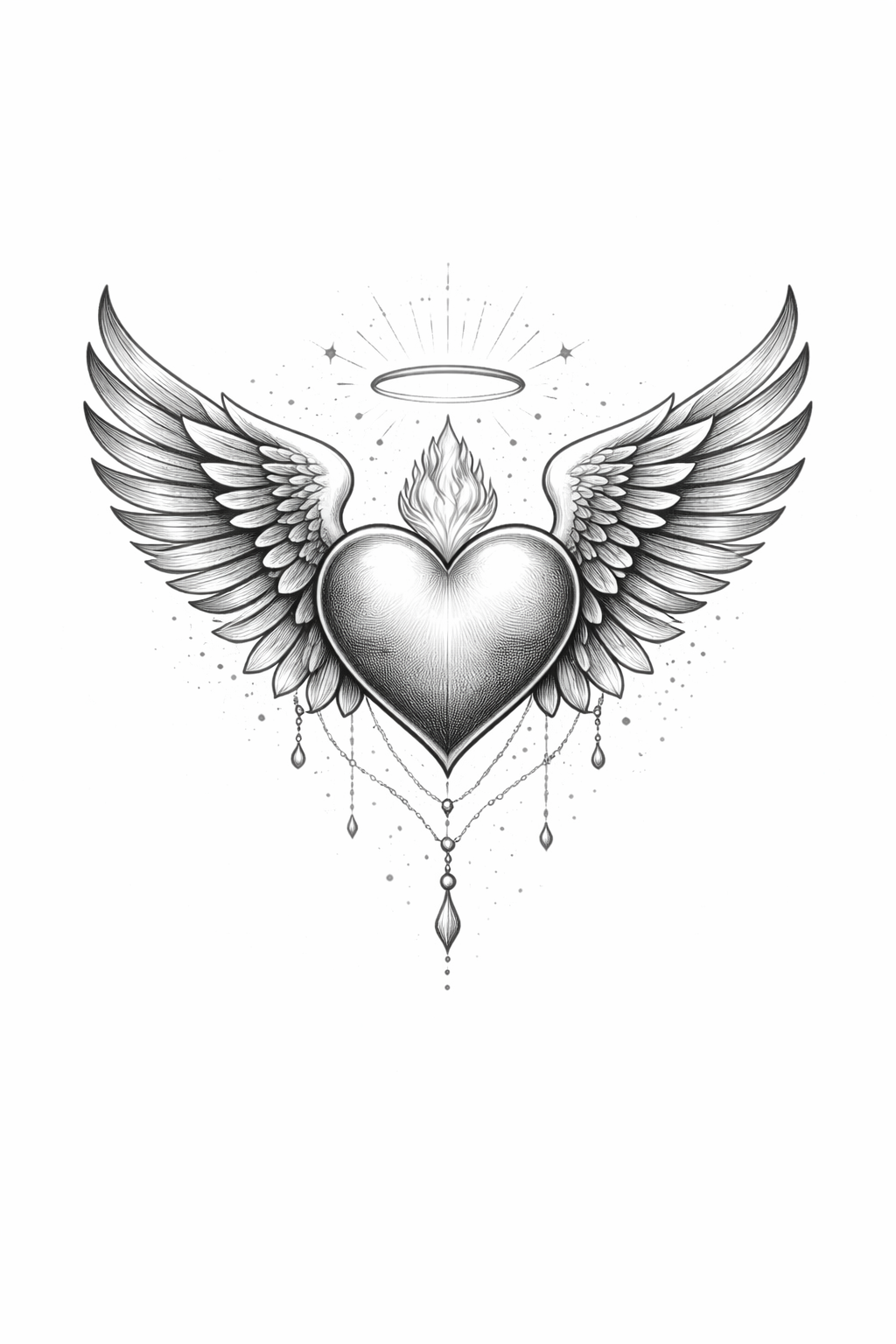 Dieses Motiv ist weich, himmlisch und sehr gefühlvoll. Das Herz mit Flamme und Heiligenschein wirkt wie ein Symbol für reine Liebe, Schutz und etwas, das über das Irdische hinausgeht. Die Flügel geben dem Motiv Leichtigkeit und Trost, während die feinen Schmuckelemente es besonders elegant machen.