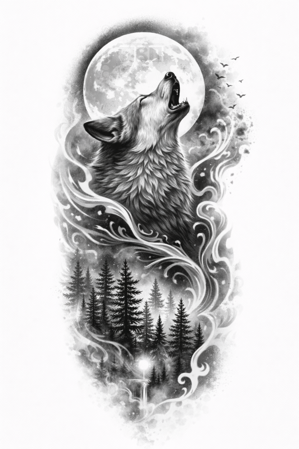 eses Design ist poetisch, ruhig und gleichzeitig voller tiefer Spannung. Der Wolf ruft in den Mond hinein, umgeben von Nebel, Wald und fliessenden, fast magischen Formen. Es ist ein Motiv, das nicht durch Aggression wirkt, sondern durch Sehnsucht, Freiheit und innere Wahrheit.