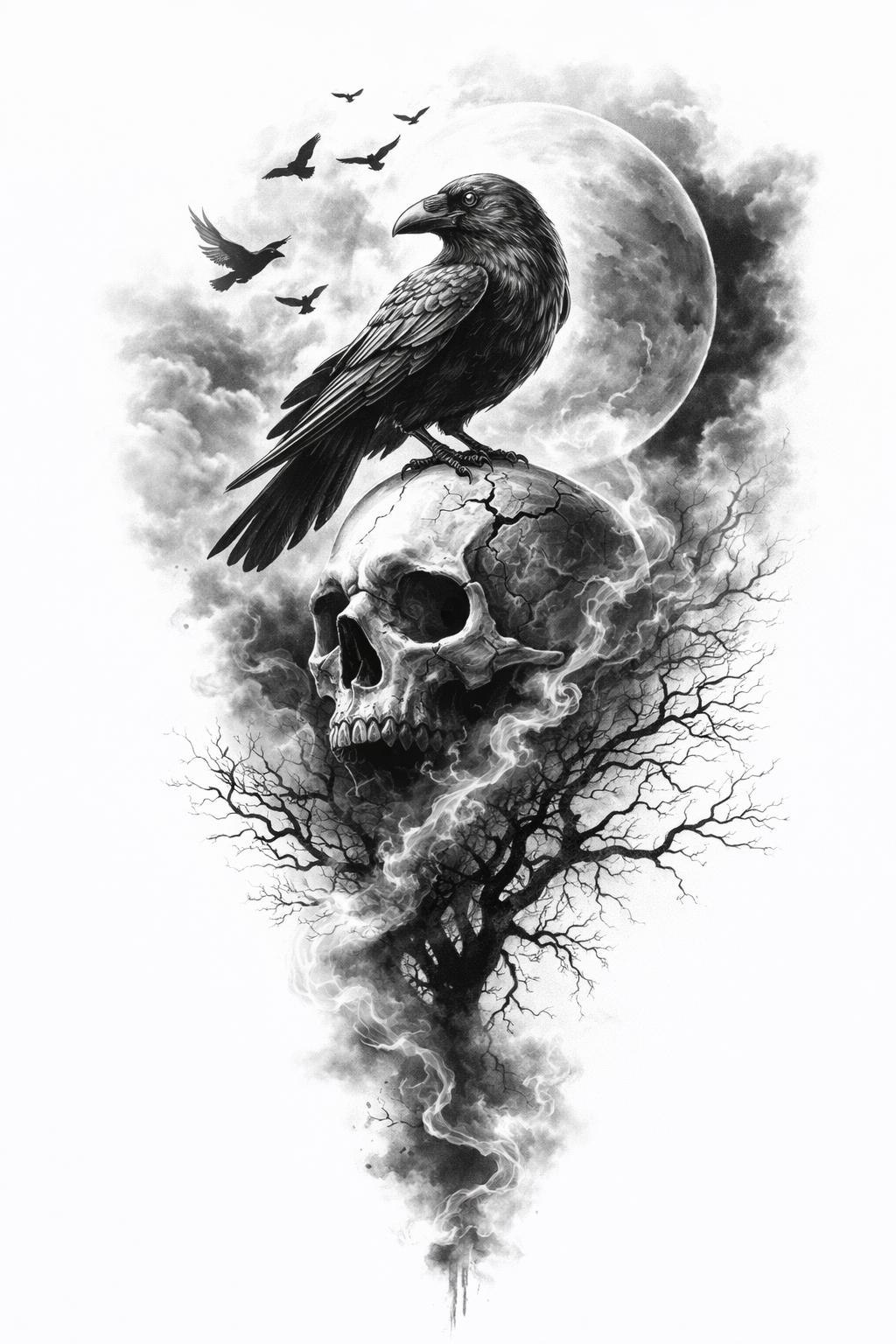 Dieses Motiv ist dunkel, klar und unglaublich atmosphärisch. Der Rabe auf dem Schädel wirkt wie ein stiller Wächter über Vergänglichkeit, Schatten und das Verborgene. Der Mond und die kahlen Äste geben dem Design eine fast unheimliche, aber gleichzeitig sehr elegante Tiefe.