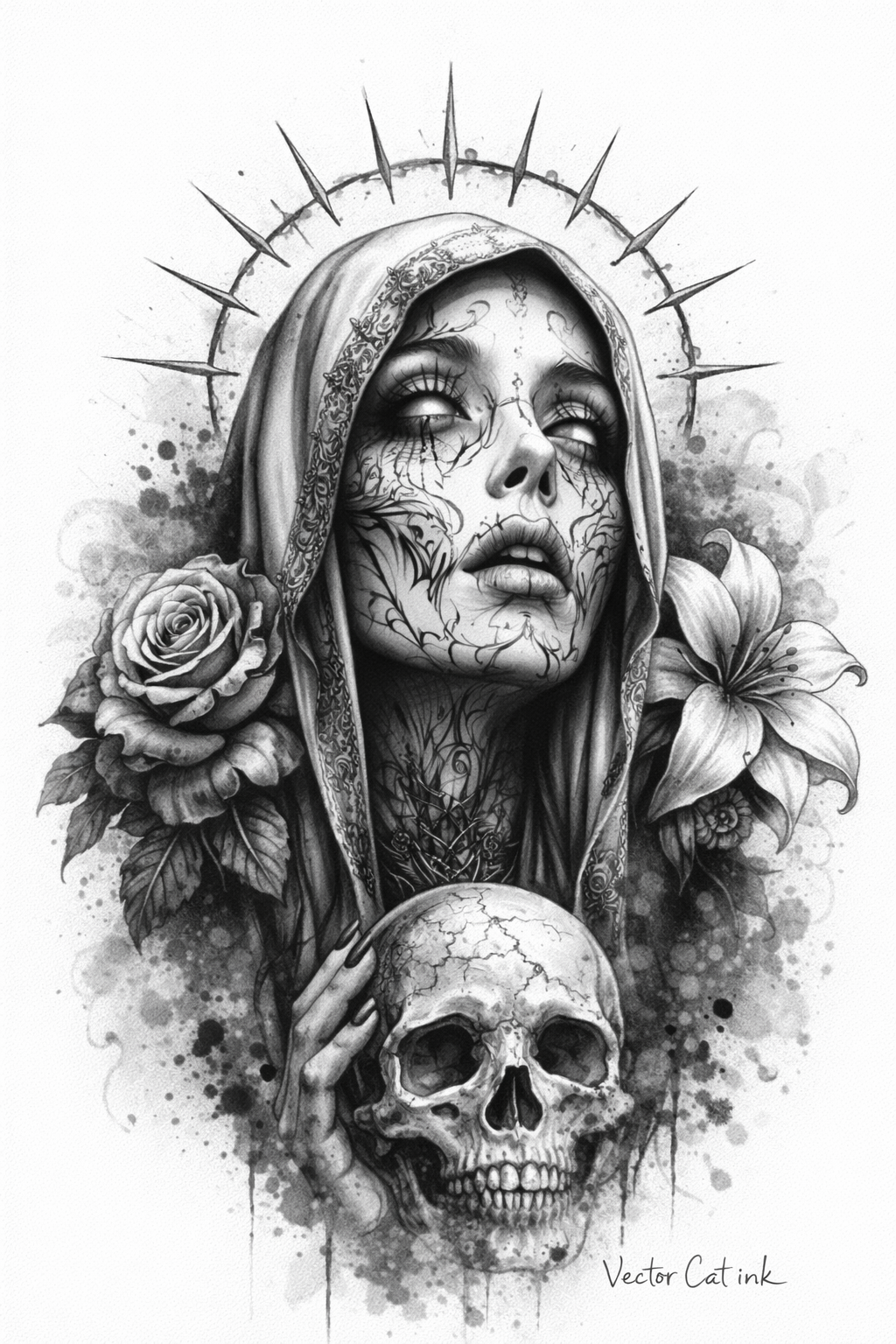 Hier wirkt die Figur wie eine moderne Heiligen-Ikone: Halo, Rauch, Splashes – wie eine Aura zwischen Diesseits und Jenseits. Die Lilie bringt das Thema Reinheit/Neubeginn hinein (oft auch mit Hoffnung & „Wieder-Aufstehen“ verbunden), während die Rose Liebe, Tiefe und die Bereitschaft zeigt, auch durch Schmerz zu gehen.
