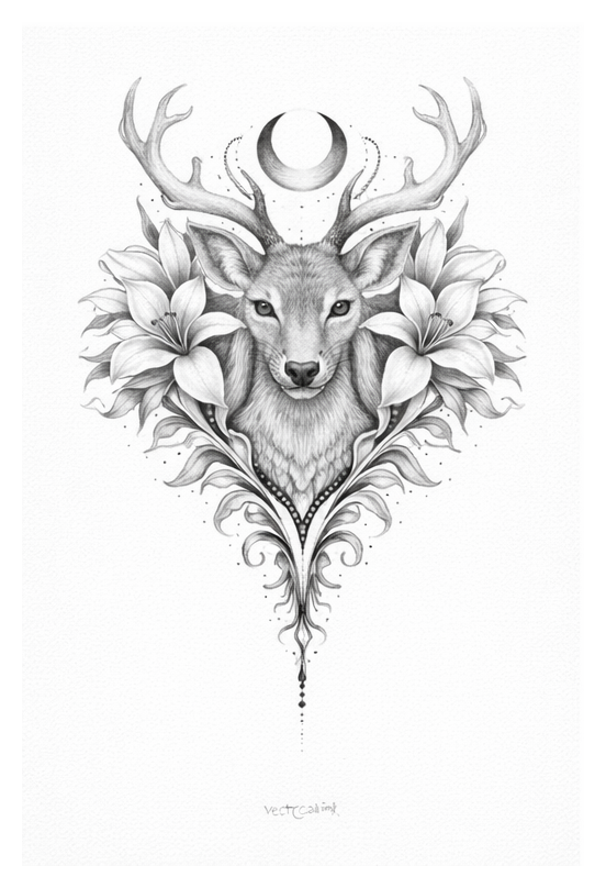 (SPEZIALPREIS) Hirsch mit Geweih, Sichelmond & Lilien