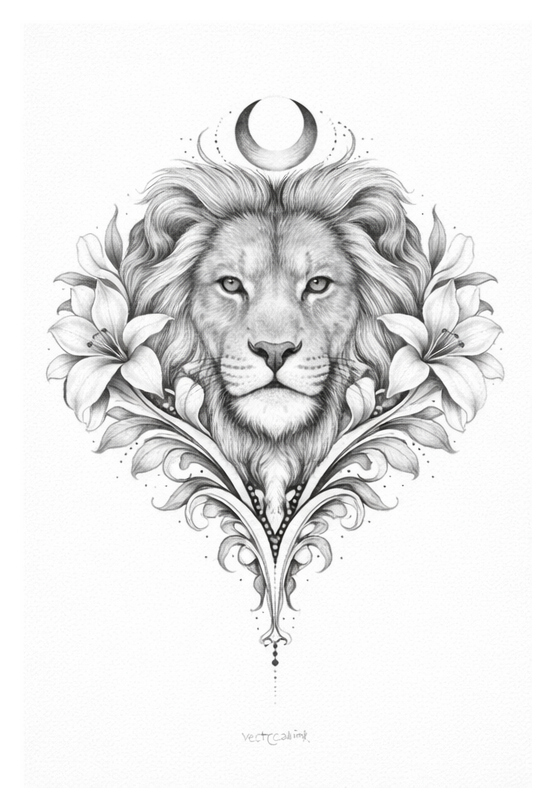 Der Löwe symbolisiert Mut, Selbstführung und innere Autorität – ruhig, aber unerschütterlich. Die Lilien verstärken das Thema Reinheit/Herzenswürde, der Mond steht für Zyklen, Intuition und den eigenen Rhythmus.