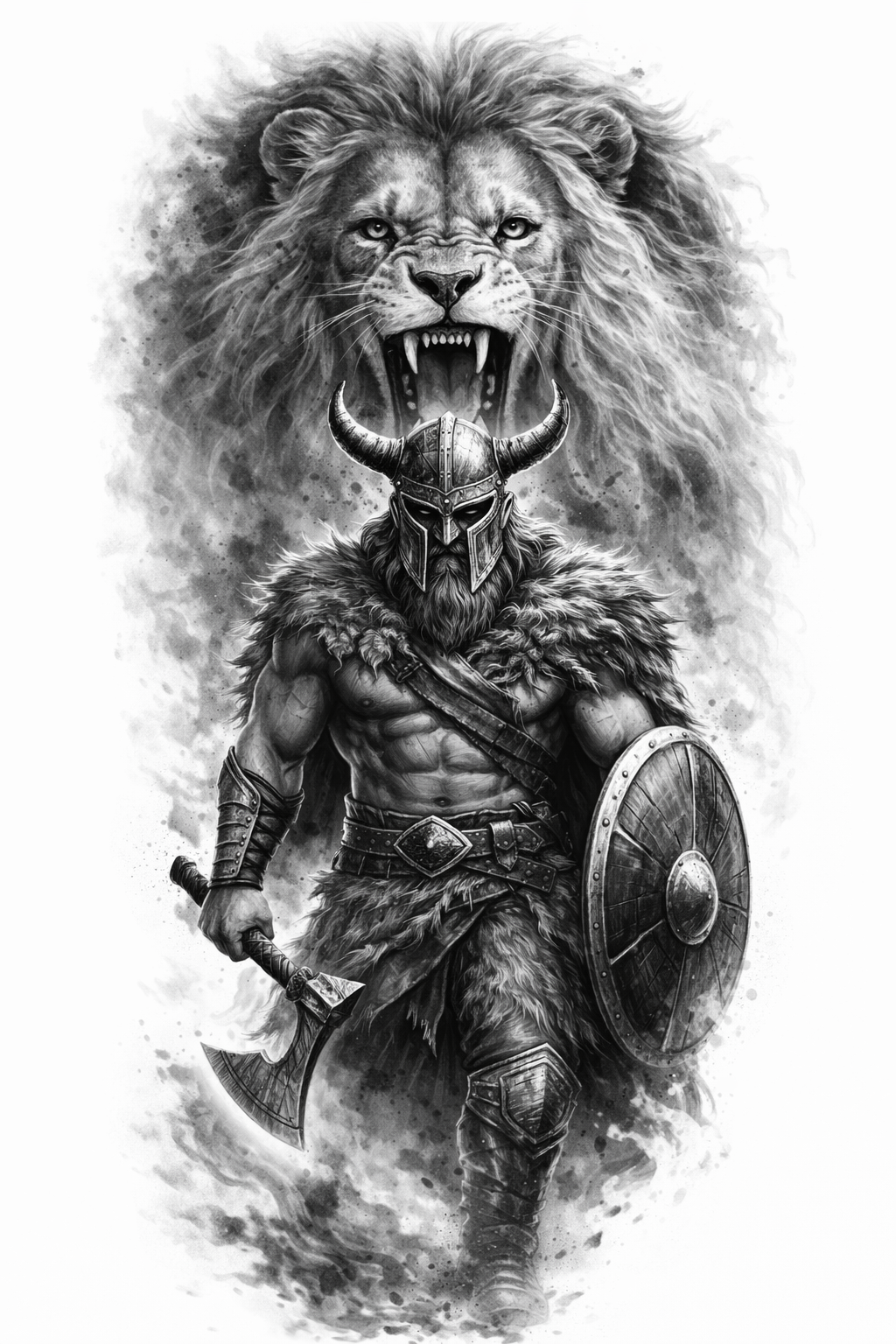 Dieses Design ist pure Dominanz und Kampfgeist. Der Wikinger tritt nach vorne, bewaffnet, gepanzert und bereit, während der riesige Löwe hinter ihm wie eine uralte Schutzmacht wirkt. Es ist ein Motiv voller Druck, Bewegung und klarer Energie – fast so, als würde es aus der Haut heraus angreifen.