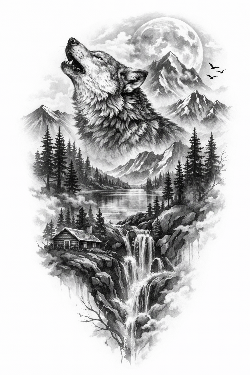 In seiner Bedeutung steht dieses Tattoo für Heimat im Inneren, Sehnsucht nach Weite und die tiefe Verbindung zur eigenen Natur. Der heulende Wolf ist nicht nur ein Wildtier – er ist Stimme, Ruf, Erinnerung und Instinkt. Die Landschaft darunter verstärkt dieses Gefühl von Ursprünglichkeit, Einsamkeit und Frieden fern vom Lärm der Welt. Dieses Motiv ist perfekt für Menschen, die sich stark mit Natur, Freiheit und innerer Wahrhaftigkeit verbunden fühlen.