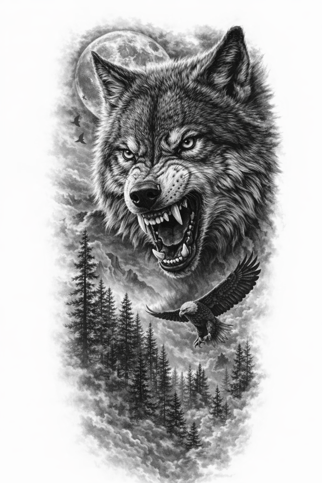 Dieses Motiv ist roh, direkt und ungezähmt. Der knurrende Wolf verkörpert die Seite in uns, die Grenzen setzt, nicht mehr schweigt und bereit ist, für das Eigene einzustehen. Der Adler darunter ergänzt das Design mit Klarheit, Stärke und Fokus, während Wald und Mond die tiefe Verbindung zur Natur, Nacht und Ursprünglichkeit betonen.