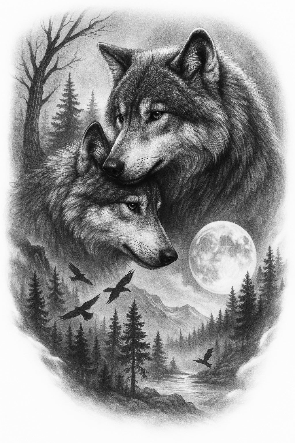 Zwei Wölfe erzählen immer eine Geschichte von Bindung, Loyalität und Führung. Dieses Design steht für das Spannungsfeld, das viele kennen: frei sein – aber nicht allein. Wölfe werden oft mit Familienband, Kooperation und Intelligenz verbunden, weil sie im Rudel stark sind und gemeinsam überleben.